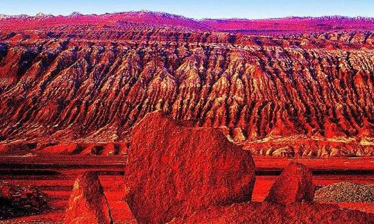 我國的吐魯番盆地:夏季炎熱,素有“火州”之稱。6、7、8月的平均氣溫都在30℃以上,絕對最高溫度可達47.8℃,這是全國氣溫的最高紀錄。盆地中部有一條東西向紅色砂巖構成的低山。山上巖石裸露,夏季驕陽照射在紅色砂巖上,紅光反射,猶如火焰,這就是自古有名的“火焰山”。古代人叫它“火州”,說它“火云滿山凝未開,飛鳥千里不敢來”。